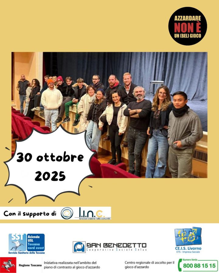 • Il giorno 30 ottobre, al termine dello spettacolo Like! di Stefano Santomauro, che si è tenuto a conclusione del progetto Cambio di rotta (promosso da Fondazione Isola d’Elba Ets) e nell’ambito del progetto Young Port 2.0 (finanziato attraverso i fondi dell’accordo tra Ceart e ASL Toscana Nord Ovest), è stato possibile presentare le azioni del progetto “Azzardare non è un bel gioco” dando luogo ad un collegamento tra le tematiche dello spettacolo (la dipendenza da smartphone dispositivi digitali) e quelle del gioco d’azzardo.