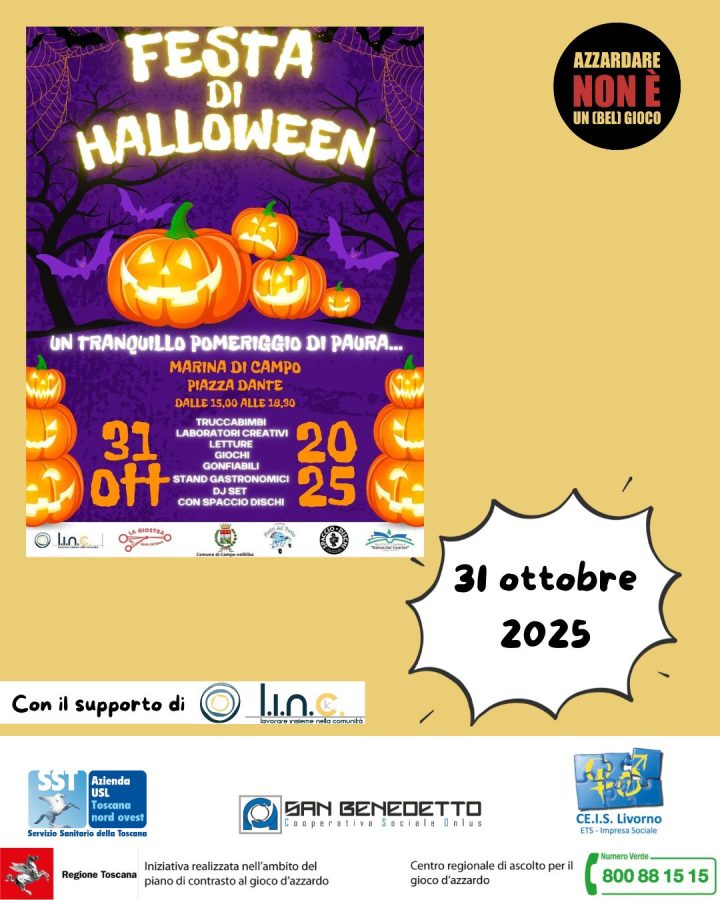 • Il giorno 31 ottobre alcuni operatori di “Azzardare non è bel gioco” sono stati presenti in piazza Dante a Marina di Campo durante la festa di Halloween. In questa occasione di coinvolgimento e partecipazione della popolazione sono state alcune informazioni sul progetto del Piano di contrasto al gioco d’azzardo.